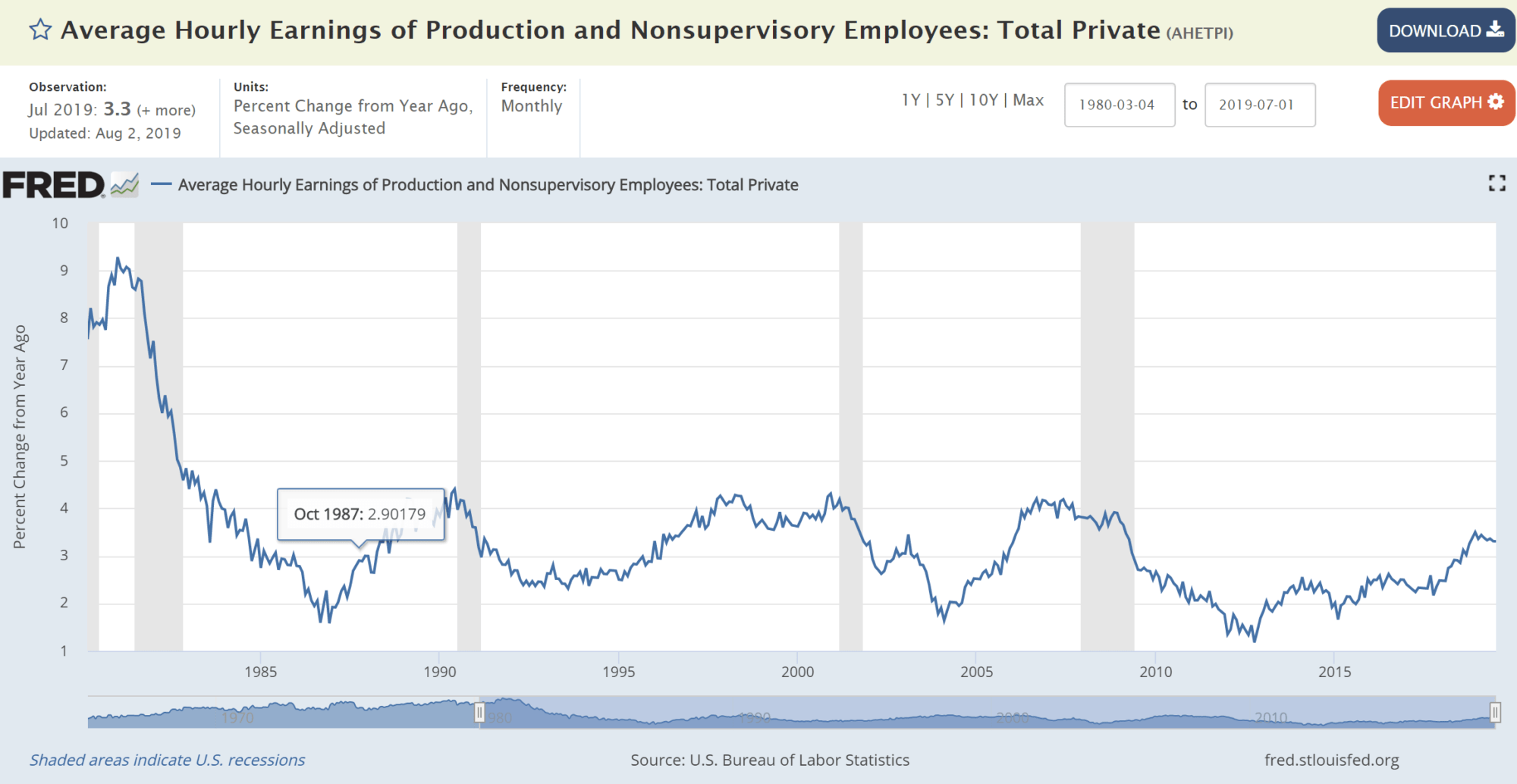 So where are we now? Despite significant economic gains over the past decade and a near-record-low unemployment rate, real wages are still below what we might expect. Right now, we’re at 3.3% year-over-year, comfortably below the 4% danger zone. Still, the possibility of future cutbacks remains since we’ve been on a slow and steady increase since the end of the Great Recession. But we aren’t there yet.