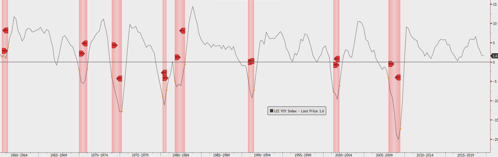 As you can see from this chart of LEI trends, right now we’re at about 1.6%. We may be hovering close to our 0% warning point, but still not there yet: