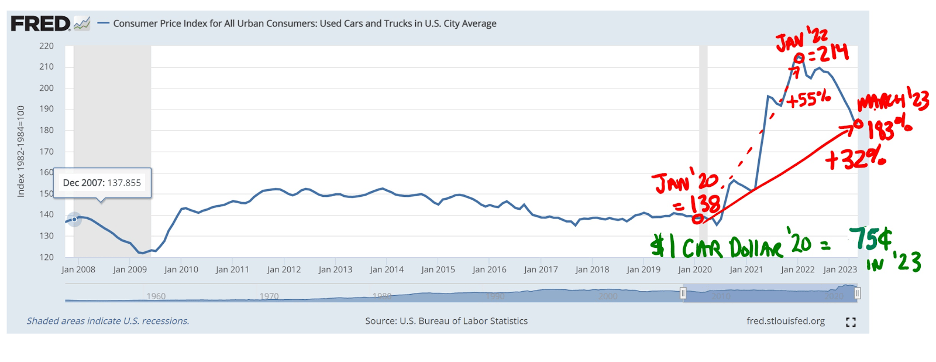 But now, let’s look at it in reverse. Presuppose that every dollar in your budget is earmarked for a particular expense.  You have food dollars, gas dollars, car dollars, etc. Using car dollars as an example, set the baseline of a $1 value in January 2020, right before the pandemic. Today, that same dollar is worth about seventy-five cents. Inflation looks a lot more real from this angle.