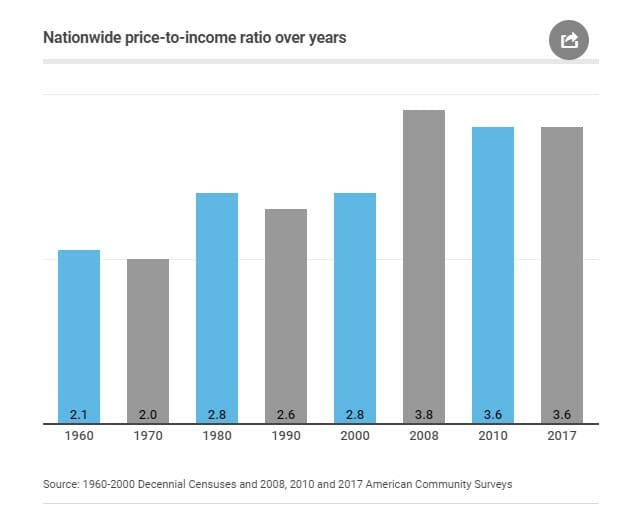 During the 1960s, the price-to-income ratio was an even 2, meaning that two years of income from a household was sufficient to buy a house. But, in 2017, the nationwide price-to-income ratio was an astonishing 3.6. This ballooning of the ratio means that homes are increasingly unaffordable, which in turn means an unstable housing market. In fact, the ratio hasn’t been at a healthy balance since the 1990s.