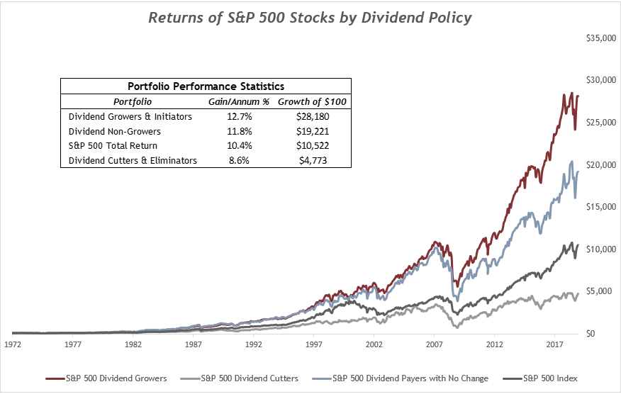 If we look at data going all the way back to 1972, dividend growers outperformed both their counterparts and the S&P 500 Index.
