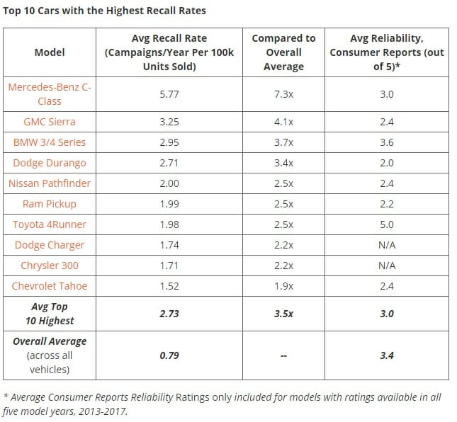 Here is iSeeCars’ data on which cars are recalled the most and which cars have the fewest issues: