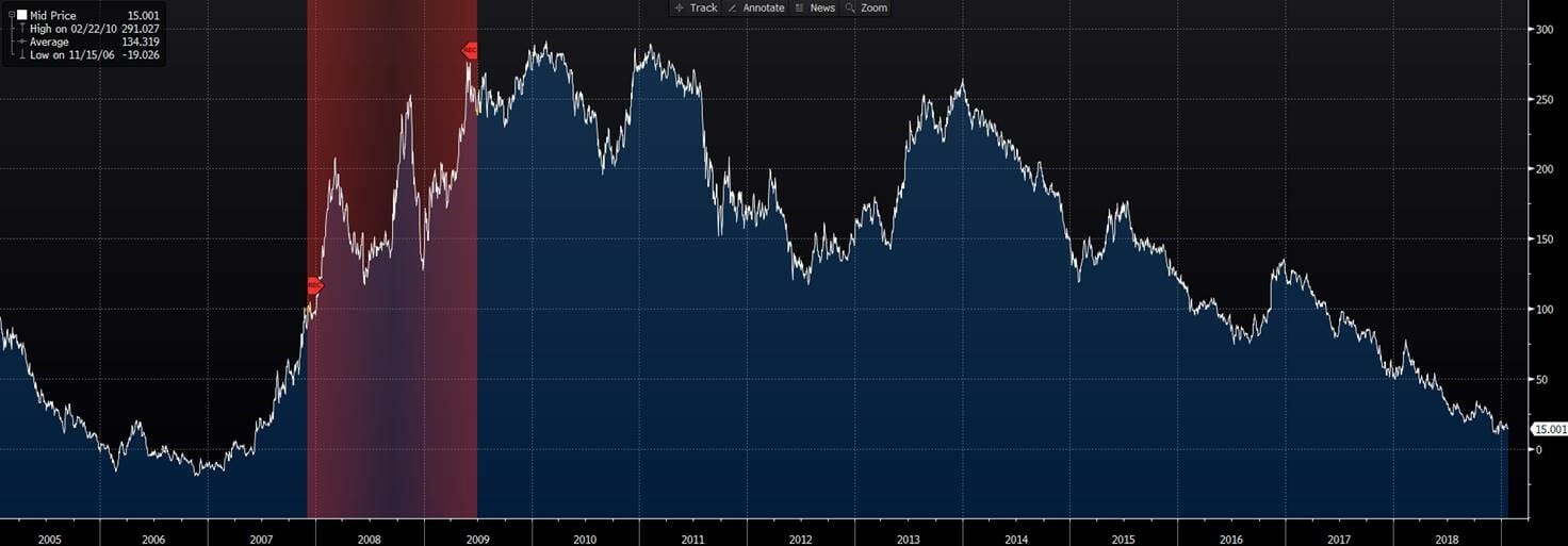The yield spread has still not inverted, which would be a strong warning sign of recession. It’s close, at 15, but still not inverted.