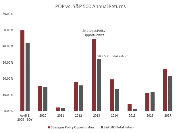 The Policy Opportunity Portfolio deploys a strategy that has proved consistently successful. With a track record since April of 2009, it has outperformed the S&P 500 by nearly 4% per year on average since inception (20.6% vs 16.8%). On a year-to-year basis, it has eclipsed the S&P 500 in 8 out of 9 years.
