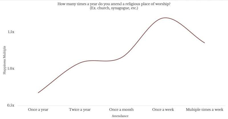 Earlier, we published findings showing that happy retirees enjoyed over 3.5 core pursuits in retirement. You can think of these pursuits as hobbies-on-steroids. Interestingly, the most common core pursuit for the happiest group: volunteering. Volunteering gives retirees the feeling of meaningful accomplishment; a self-satisfaction that is hard to replicate outside of acts of service and giving. Church (or other religious participation) is filled with outlets for this. Sunday school volunteering, global missions trips or dropping a $20 in the offering basket — you’d be hard-pressed to find as many easy means for a service-led happiness boost in one place. And the more you go, the more likely you’re participating in one or more of these.